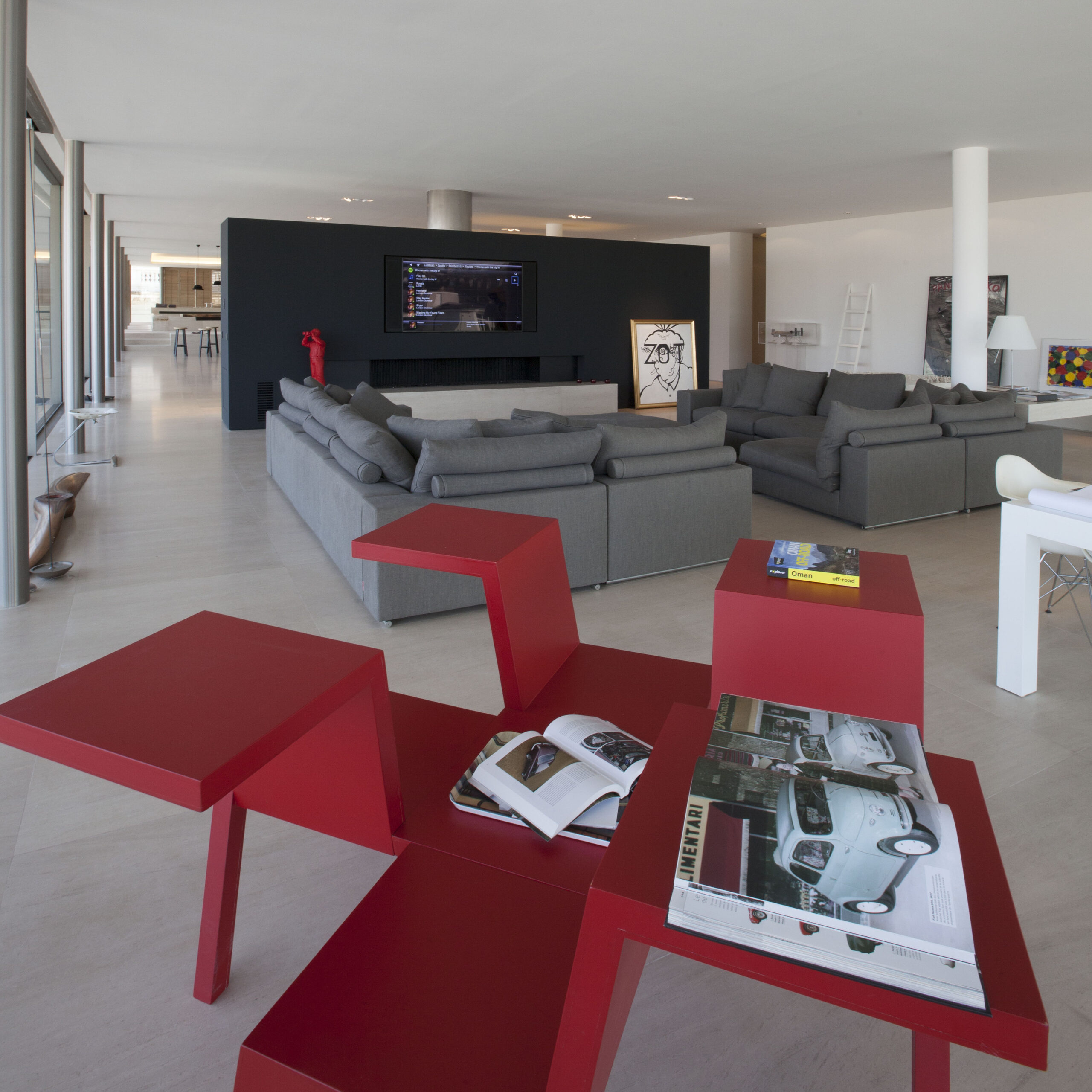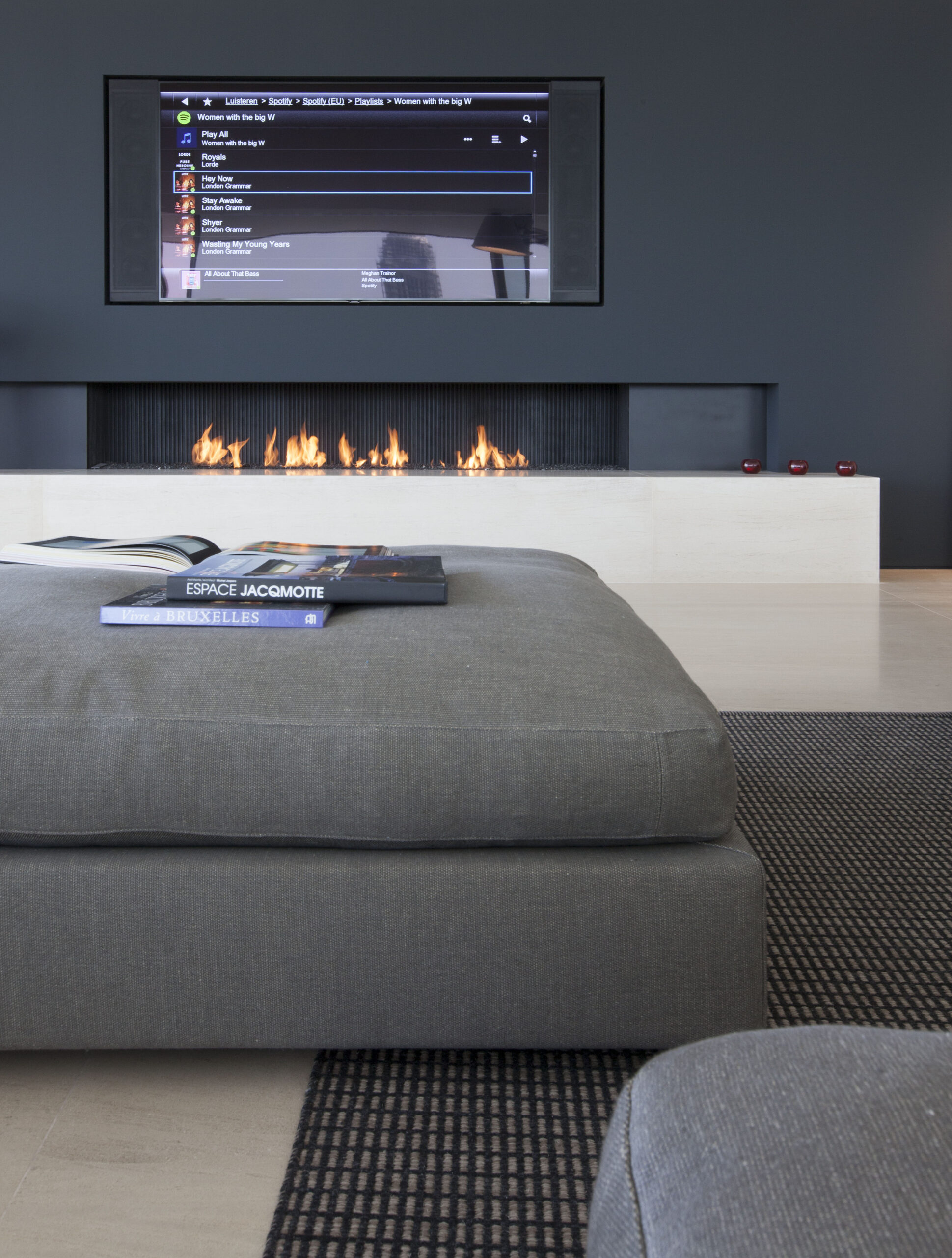 The television is seamlessly integrated into the home automation system, allowing it to be controlled with the same remote control or via an app. Whether it is a relaxing evening in front of the fireplace or a movie night, the gas fireplace and television work perfectly together to create the ultimate viewing experience in a comfortable setting. These smart solutions increase ease of use and effortlessly bring technology and design together in everyday life.